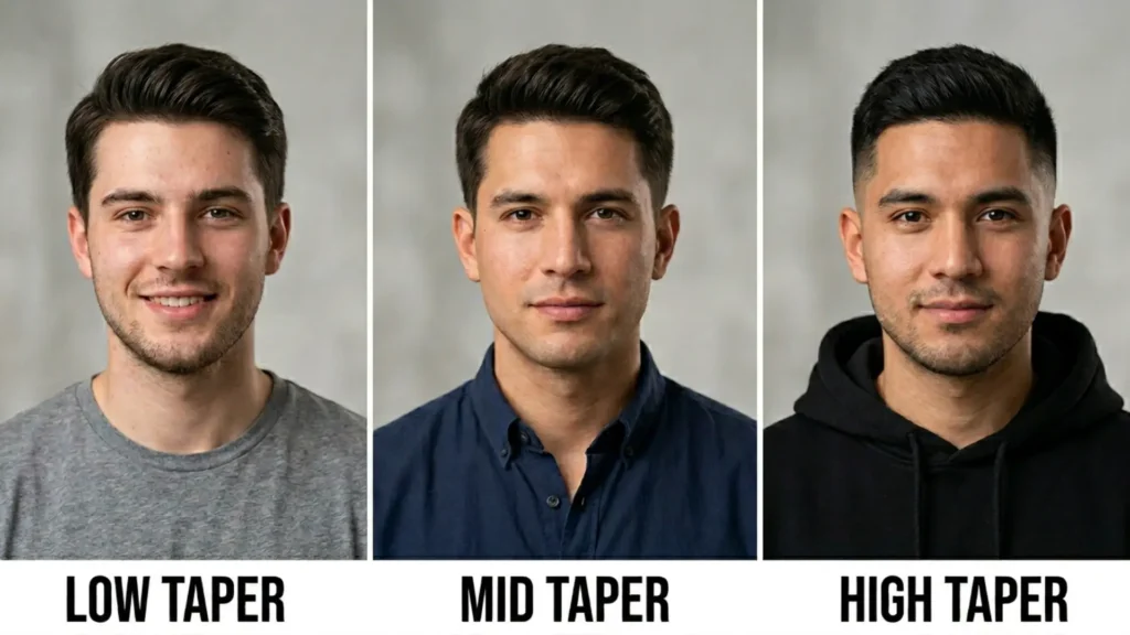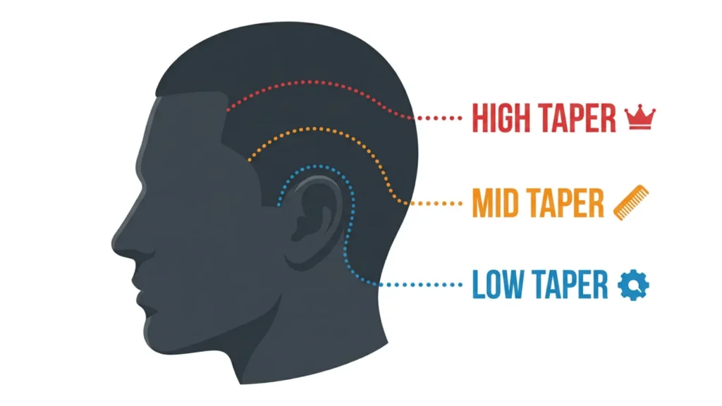 The difference between a low taper, mid taper, and high taper comes down to one thing: where the fade starts on your head. A low taper begins just above your ears, a mid taper starts at temple level, and a high taper begins near the crown.